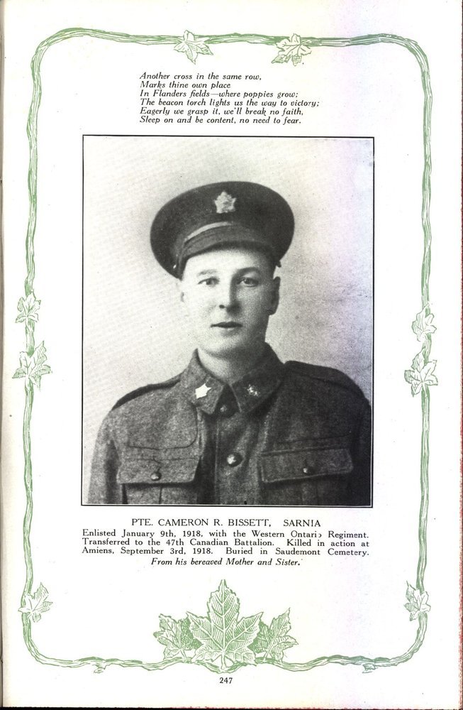 (Sarnia; Western Ontario Regiment; 47th Canadian Infantry Battalion; killed in action; Amiens; Saudemont Cemetery)